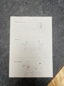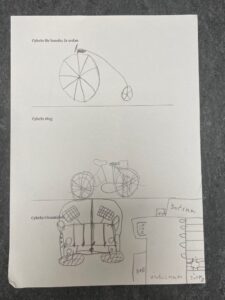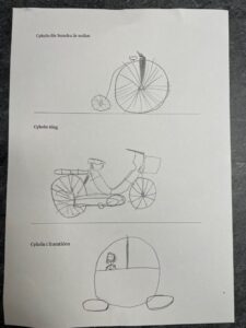På tekniken har vi arbetat med cykeln och hur den har förändrats och utvecklats genom åren. Eleverna har arbetat i par, de har använt ipaden för att själva söka information. Deras uppgift var att jämföra en cykel som fanns för 100 år sedan med en cykeln idag. Tillsammans sökte de bilder och information och skrev ner likheter och skillnader. Därefter ritade var och en bilder på cykeln för hundra år sedan, idag och framtidens cykel så som de tror att den kan komma att se ut.